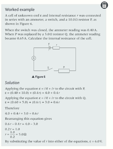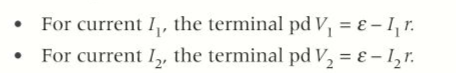 - Internal resistance and the emf of a cell can be calculated if the terminal pd is known for two different values of current.
