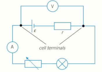 - When a cell of emf ε and internal resistance r is connected to a resistor of resistance R as shown below, all the current through the cell passes through its internal resistance and the external resistor.